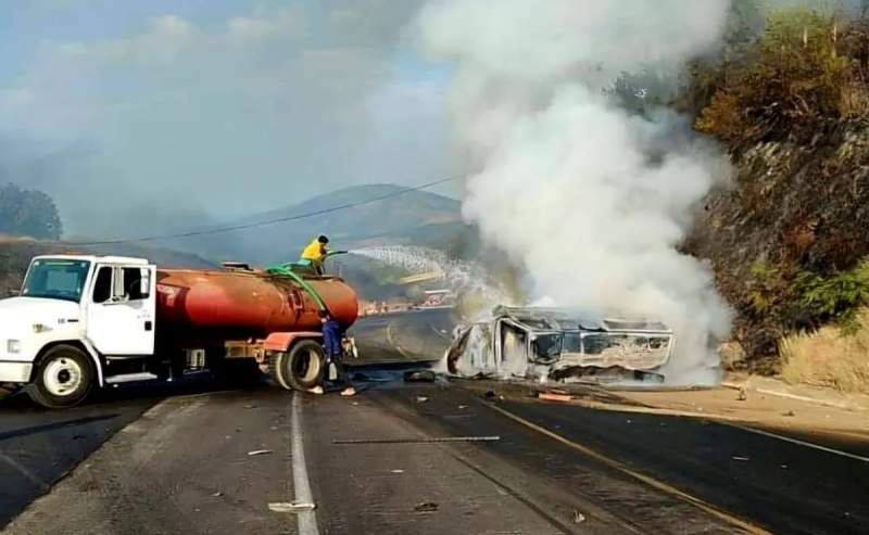 Los hechos se registraron la mañana del viernes, en el kilómetro 91 de la autopista Siglo XXI, a la altura de Ziracuaretiro, en Michoacán, donde una camioneta y un tráiler chocaron de frente, provocando que ambos vehículos ardieran en llamas.
