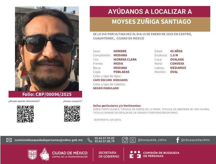 En redes sociales, su hermana Anny Zúñiga escribió: "A nombre de mi familia comparto la foto de mi hermano Moyses por si alguien en la CDMX sabe de su paradero. Confiamos en que se comunique pronto. Moy, te queremos, comunícate”.