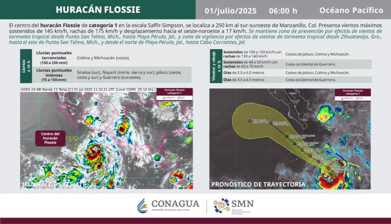 Nacional.- El huracán “Flossie” permanece en categoría 1 en la escala Saffir-Simpson, pero continúa ganando fuerza y podría convertirse en huracán de categoría 2 en las próximas horas, informó este lunes Conagua Clima.